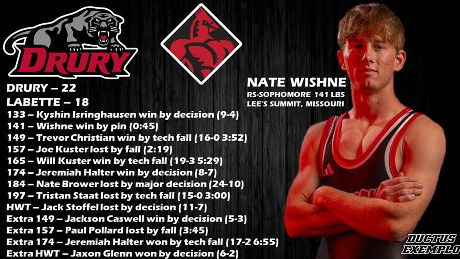 With bonus-point wins from Nate Wishne (141), Trevor Christian (159), and Will Kuster (165), along with hard-fought decision victories from Kyshin Isringhausen (133) and Jeremiah Halter (184), Drury edged past the Labette Cardinals.