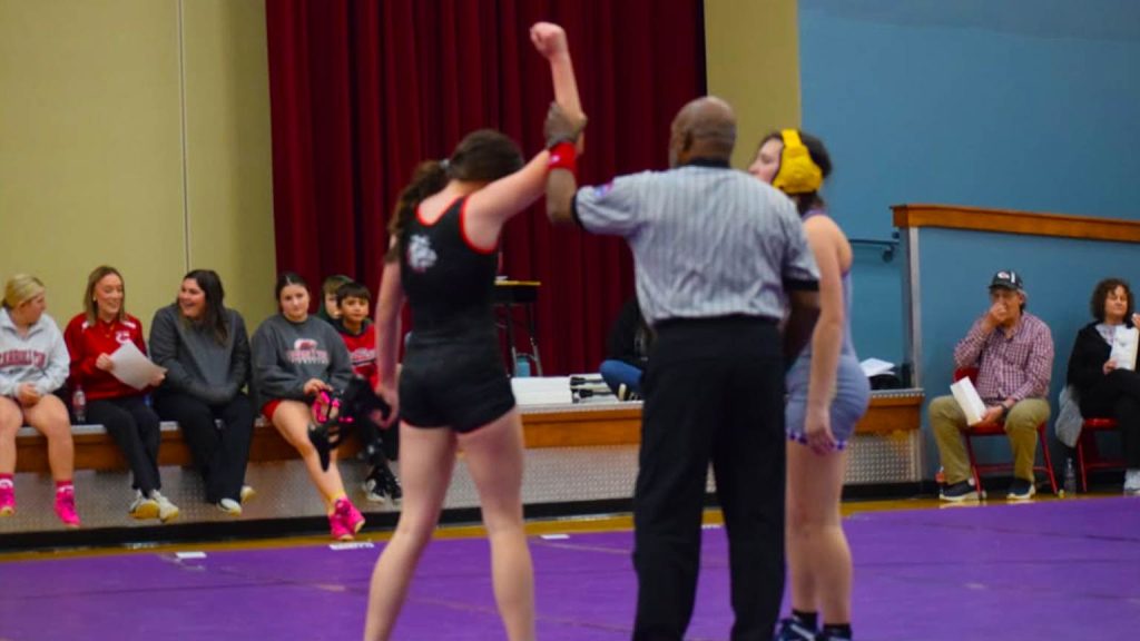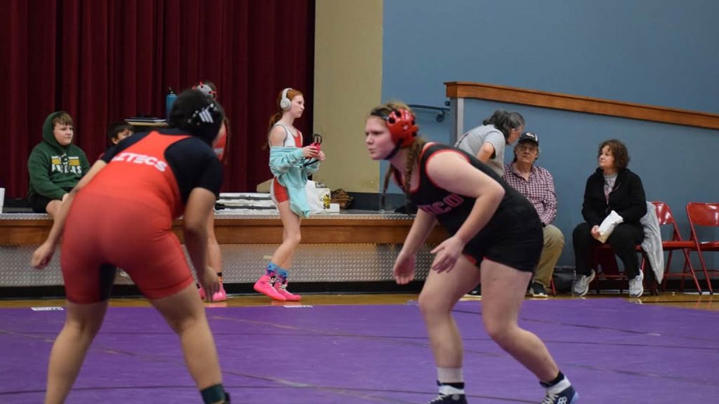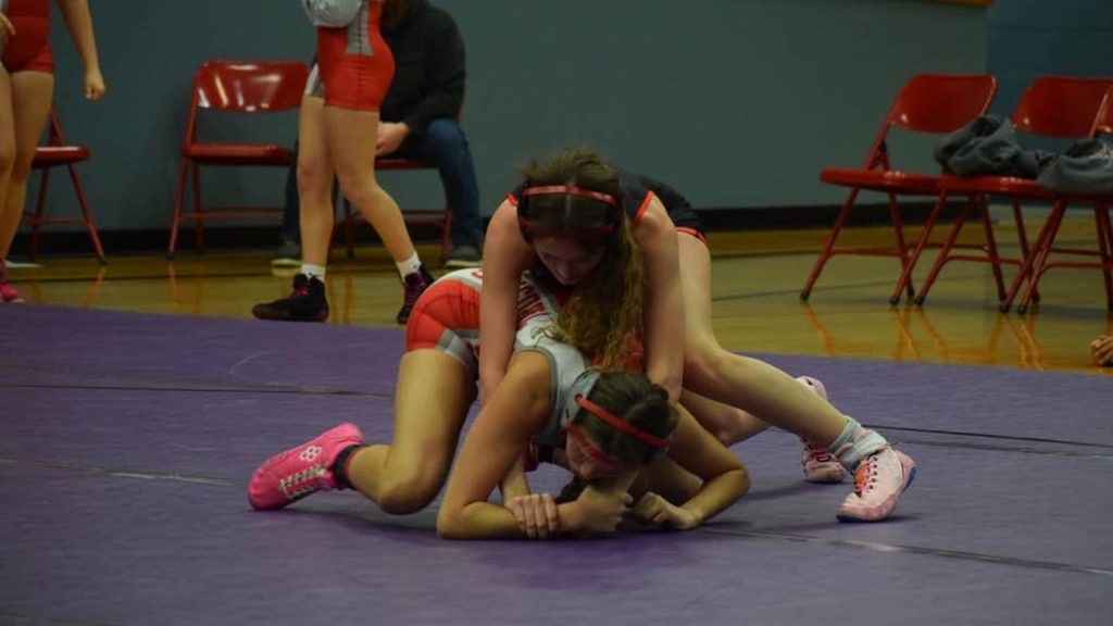 The fourth round was full of back and forth excitement and it had the feel of a semi-final team matchup.This was another District 2 matchup for the Mexico Lady Bulldogs and it was a back and forth dual that got the home team fans excited. With each bout contested, each side’s bench was cheering and encouraging their wrestler on towards victory. Both teams won 6 matches each (there were 2 double forfeits at 125 lbs. and 130 lbs.). The difference maker was at 115 lbs. While all of her teammates had earned maximum points for their efforts, Khloe Hanson of Carrollton earned a major decision by beating Addison Bowling 14-6. She had the opportunity on a few occasions with Bowling on her back but Bowling was able to escape the danger.